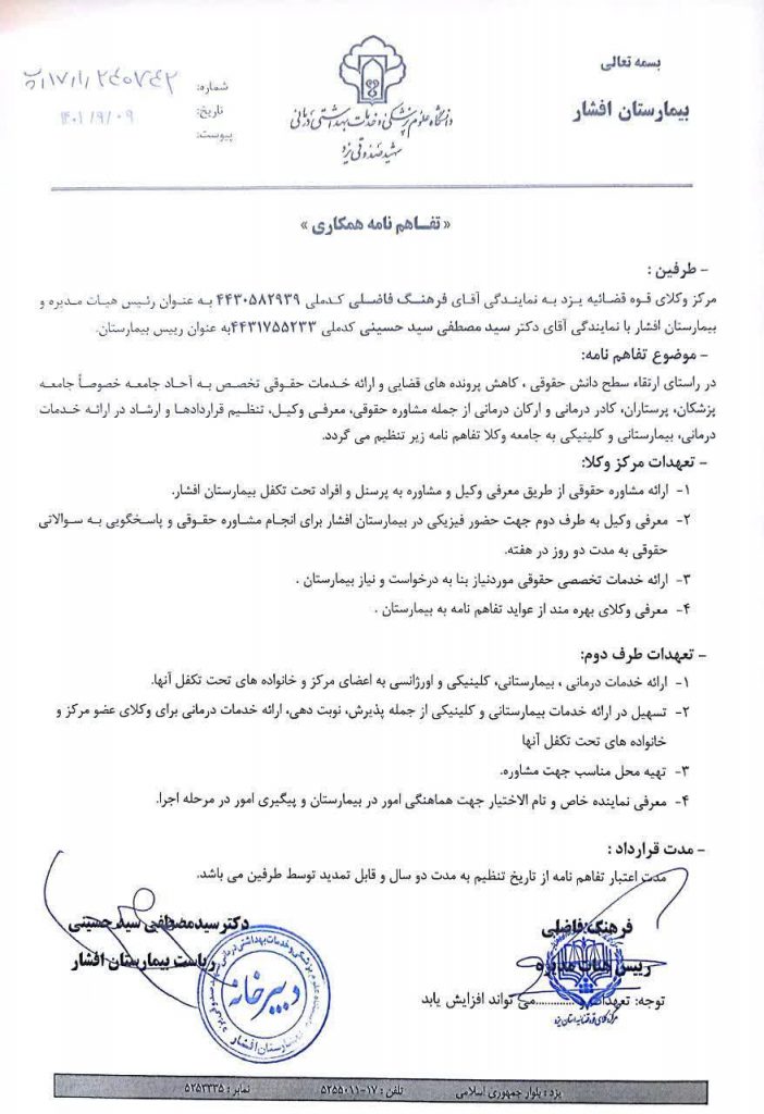 انعقاد تفاهم نامه مرکز وکلای قوه قضائیه استان یزد با بیمارستان افشار جهت استفاده از امکانات درمانی