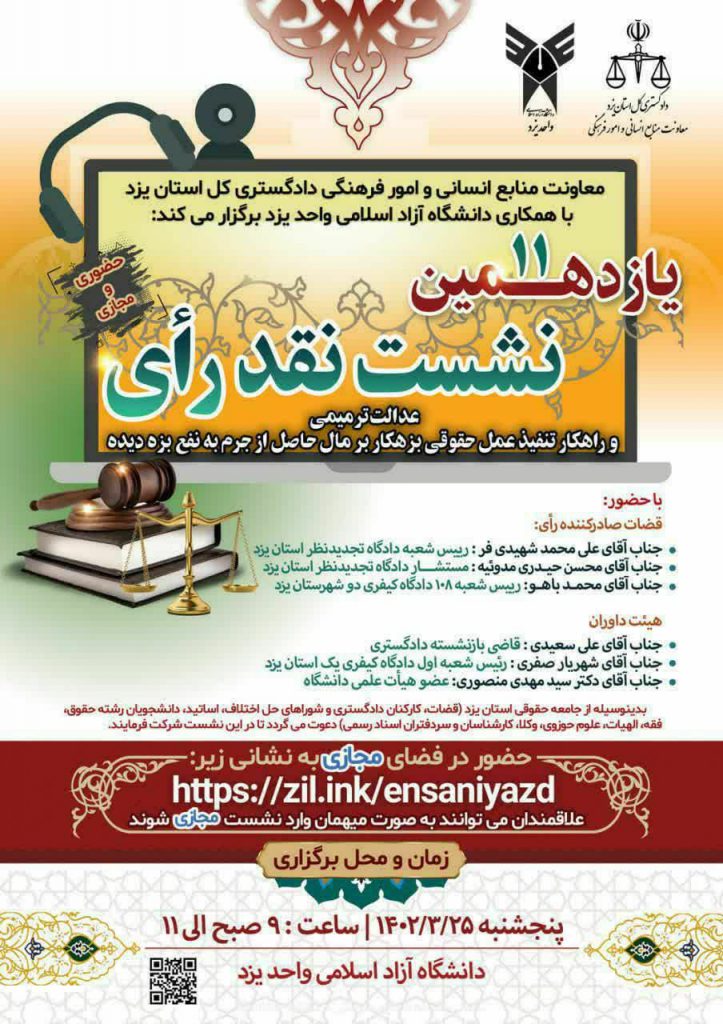 برگزاری یازدهمین نشست *حضوری* نقد رای با موضوع *عدالت ترمیمی و راهکار تنفیذ عمل حقوقی بزهکار بر مال حاصل از جرم به نفع بزهدیده * *پنجشنبه این هفته* مورخ ۲۵ خرداد، ساعت ۹ صبح الی ۱۱