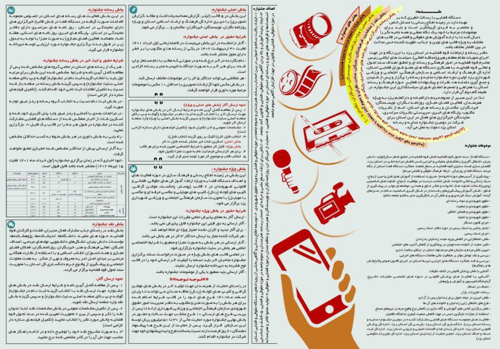 🔻آخرین مهلت ارسال آثار: ۳۰ اردیبهشت ماه ۱۴۰۲ 🔻اطلاعات بیشتر و ارسال آثار: adliehyazd.ir ✔️دبیرخانه جشنواره: یزد بلوار مدرس دادگستری کل استان یزد، دفتر رسانه و ارتباطات قوه قضائیه در استان یزد تلفن تماس: ۰۳۵۳۸۲۷۰۶۱۵ 🔸اختتامیه: تیرماه ۱۴۰۲