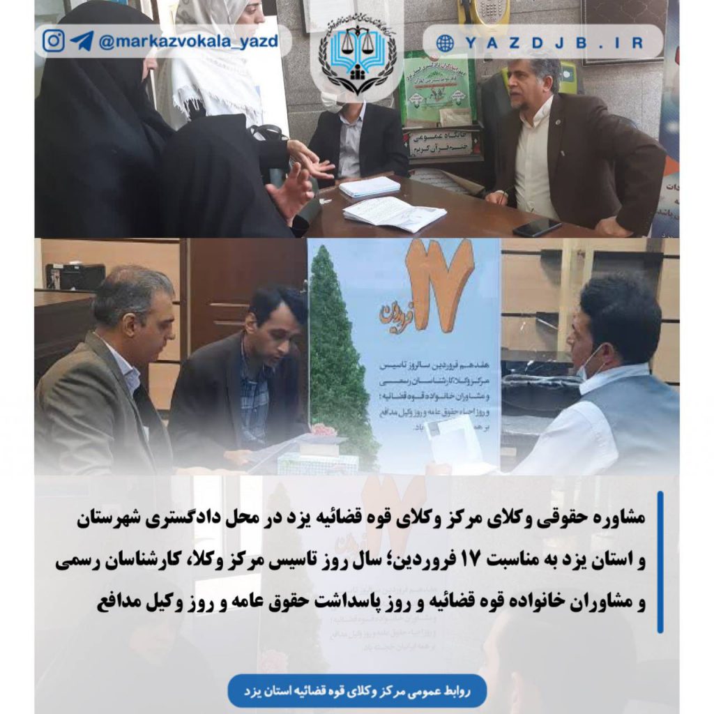 مشاوره حقوقی وکلای مرکز وکلای قوه قضائیه یزد در محل دادگستری شهرستان و استان یزد به مناسبت ۱۷ فروردین؛ سال روز تاسیس مرکز وکلا، کارشناسان رسمی و مشاوران خانواده قوه قضائیه و روز پاسداشت حقوق عامه و روز وکیل مدافع گالری پیدا نشد !