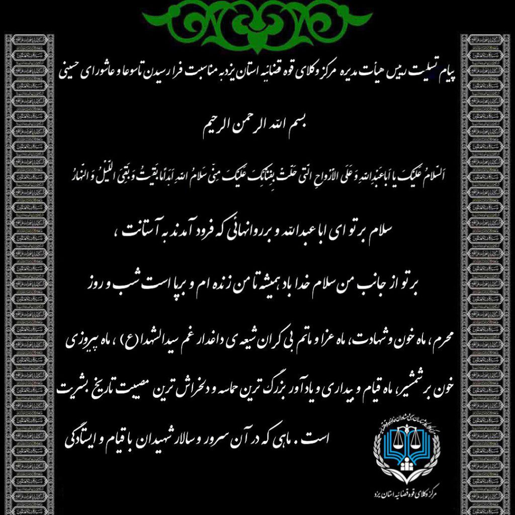 رییس هیأت مدیره وکلای قوه قضاییه استان یزد با صدور پیامی فرارسیدن ایام شهادت سرور و سالار شهیدان اسلام امام حسین(ع) و حضرت ابوالفضل( ع) را به همه شیعیان تسلیت گفت.