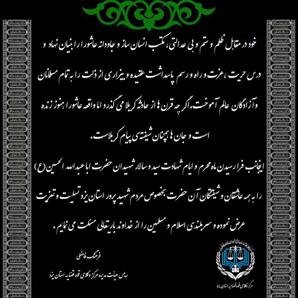 اگر چه قرن ها از حادثه کربلا می گذرد اما واقعه عاشورا هنوز زنده است و جان ها همچنان شیفتهی پیام کربلاست. اینجانب فرا رسیدن ایام شهادت سید و سالار شهیدان حضرت ابا عبدالله الحسین(ع) و حضرت ابوالفضل (ع)را به همه عاشقان و شیفتگان آن حضرت بخصوص مردم شهید پرور استان یزد تسلیت و تعزیت عرض نموده و سربلندی اسلام و مسلمین را از خداوند باریتعالی مسئلت می نمایم.
